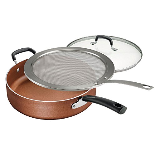 Tramontina's Titanium-Reinforced Nonstick Sauté Pan Set is useful for so many cooking tasks: frying, sauteing, searing, browning, deglazing or braising. The Tramontina saute pan is constructed of heavy-gauge aluminum that provides even heat distribution. The titanium-reinforced nonstick interior coating is PFOA-free and easy to clean, while the ergonomically designed black, soft-grip silicone handles are riveted for added support. Dishwasher and oven-safe (up to 350 degrees Fahrenheit), the saute pan is also compatible with gas, electric and ceramic glass cooktops. The splatter screen is made of stainless steel and protects your cooktop from splatters when cooking messy foods. It fits over the rim of your pan, allowing steam to escape, which is ideal for creating rich, savory sauce reductions to add intense flavor to your meal.Feature