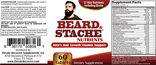 -. Feature : BEARD & STACHE NUTRIENTS FOR MEN: 27 Beard and Mustache Facial Hair Growth Nutrients in 1 Formula / Fast and healthy facial hair growth support - First time customers get 10% OFF with coupon code: 7XLFTGE7 - Satisfaction 100% guaranteed or your money back! / Supports healthy looking hair growth by providing Biotin (5000 mcg) + herbal extracts + vitamins + minerals for maximum beard growth / mustache growth / beard health / Beard growth products, balms, and treatment oils can only do so much; pure vitamin and herbal support is the most effective way to grow your facial hair for amazing results | Beard Growth Supplement | Facial Hair Growth Nutrients | Beard Growth Pills for Men / Professionally Formulated with: Biotin, Vitamin C, Vitamin E, Vitamin B-6, Pantothenic Acid, Zinc, Selenium, Copper, Manganese, MSM, Silica, Hydrolyzed Collagen Type 1 & 3, L-Methionine, Citrus Bioflavonoid 50% Complex, Hydrolyzed Keratin, Hyaluronic Acid, Alpha Lipoic Acid, Gotu Kola Extract, Grape Seed 95% Extract, Fo-Ti Root Powder, Indian Gooseberry Fruit Extract, Goji Berry 40% Extract, Bladderwrack Powder, Nori Yaki, Wakame Powder, Olive Water Extract, and Natural Astaxanthin Complex