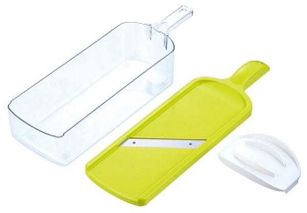 特殊加工の薄刃で切れ味抜群です。キャベツ、玉ねぎ、レモン、トマト、ジャガイモ等スライス用途いろいろ。受容器はすべりにくい底ゴム付き&小さめの食材に便利な安全ホルダー付きです。 |