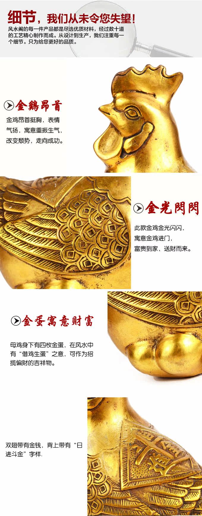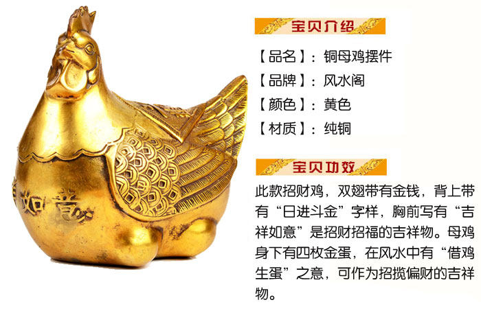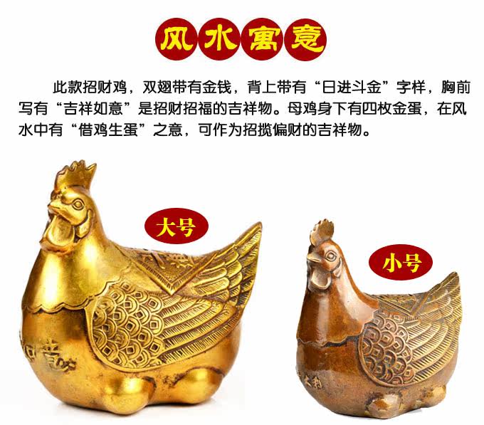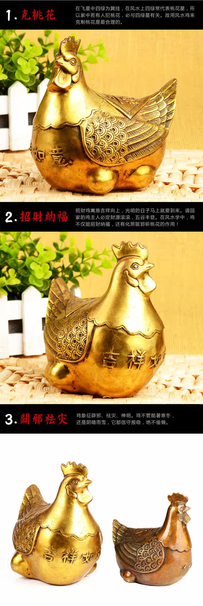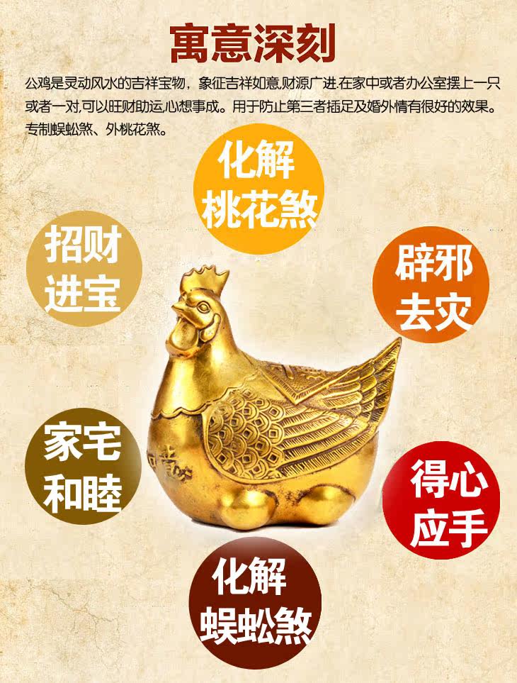| 【相关介绍】 鸡是灵动风水的吉祥宝物,象征吉祥如意,财源广进.在家中或者办公室摆上一只或者一对,可以旺财助运,心想事成。用于防止第三者插足及婚外情有很好的效 果。专制蜈蚣煞、外桃花煞。如化解偏桃花:有心怀不轨异性觊觎着您的配偶,或令你讨厌的性骚扰,若怀疑配偶有婚外情,可将之摆放在家中,最好用一对,左右 各一放在爱人衣柜暗角。 鸡喙对着门外或者窗外。 在家中或者办公室摆上一只或者一对,可以旺财助运、心想事成。化解配偶婚外情及第三者,此宝物大门对冲之处.比如摆放在架上,或者藏在最常拉开的抽屉中,可禁绝外来桃花影响。 另外此宝物专利于以口为职业特点的专业人士,如律师、直销人员、教师、娱乐场所等,有助于主人工作上得心应手。 |