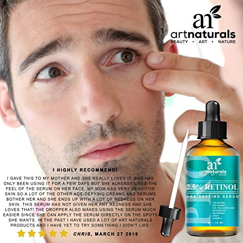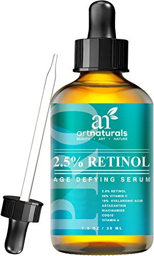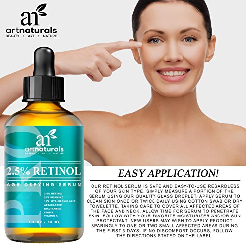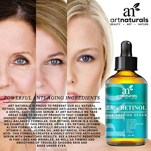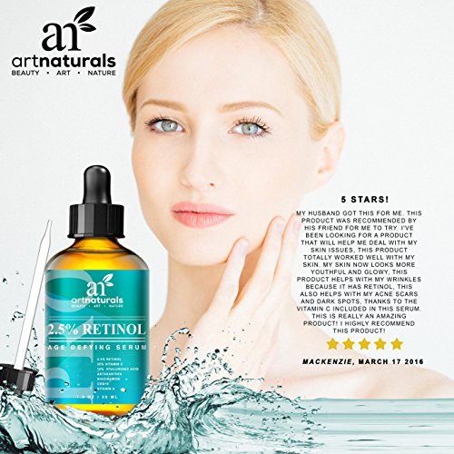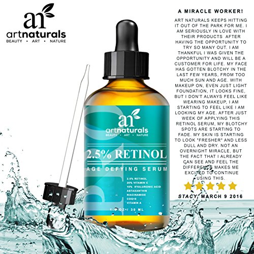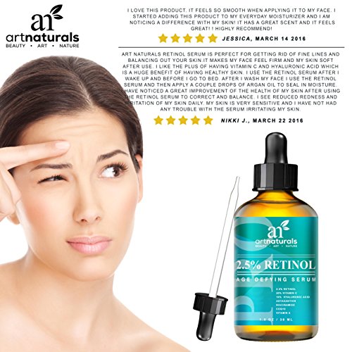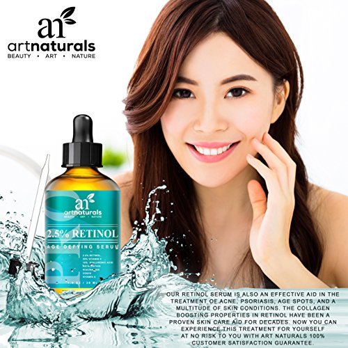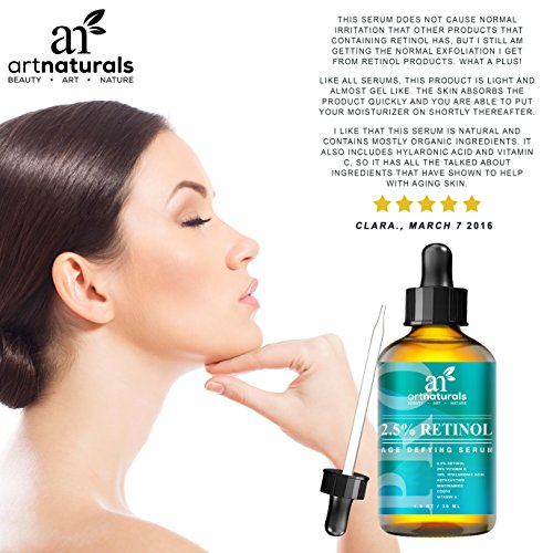 Retinol's a star for its ability to turn back time for skin. ArtNaturals' retinol serum's a superstar for its enhanced ingredients, which include hyaluronic acid, aloe Vera and vitamins e and c. This antioxidant power blend goes after crow's feet, fine lines, age spots, and pesky bags, rejuvenating and renewing. Great for hands as well. Art naturals' retinol serum contains 2.5 percent retinol (vitamin a). The collagen-boosting properties of retinol have been a proven skincare aid for decades. As skin ages, its cells replace themselves more slowly, leaving skin less able to repair itself after day-to-day damage. Retinol promotes exfoliation, which smoothest skin and enhances the effects of skincare products by removing the dead layer of cells that inhibits absorption. Our retinol serum benefits oily skin by reducing skin oil production. The exfoliating effect also helps keeps pores clear, leading to fewer breakouts, making it possibly the best facial treatment for oily skin. And our formula is artfully infused with all-natural vitamin c, aloe Vera, jojoba oil, and botanical hyaluronic acid. Jojoba oil's high concentration of vitamin e promotes healthy, soft and clear skin, while its antioxidant-richness helps to prevent the breakdown of healthy skin cells, known as the free-radical process. This combination creates a highly effective anti-aging serum with unmatched results. You'll see a drastic reduction in fine lines and wrinkles, as well as firming and smoothing of under-eye sagging skin and bags. Art naturals' retinol serum is also an effective aid in the treatment of acne, psoriasis, and a multitude of skin conditions.