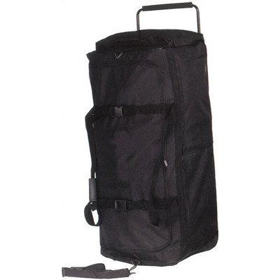 Product Description Made of 600D polyester. A great piece for sales samples. 2 zippered front pockets, additional zippered pocket on one end of the duffel. Features a sturdy pull handle and dual wheels on thebottom. 2-3 heavy-duty bottom rails help support heavy loads.* Size: 34"L x 16"H x 15"D *Colors: Black 0
