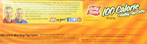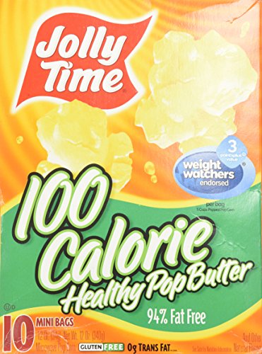 -. Binding : Misc. -. Brand : Jolly Time -. EAN : 0028190001119 -. Feature : Jolly Time Healthy Pop butter / 94% Fat Free, 100 calorie per bag / 10 Ct Mini Microwave Pop Corn bags / Butter Flavor / Endorsed by Weight Watchers -. IsAdultProduct : 0 -. Label : American Pop Corn Company -. Manufacturer : American Pop Corn Company -. PackageQuantity : 10 -. ProductGroup : Grocery -. ProductTypeName : GROCERY -. Publisher : American Pop Corn Company -. Studio : American Pop Corn Company -. Title : Jolly Time Popcorn 100 Calorie Healthy Pop Butter Mini Bags - 10 CT -. UPC : 028190001119