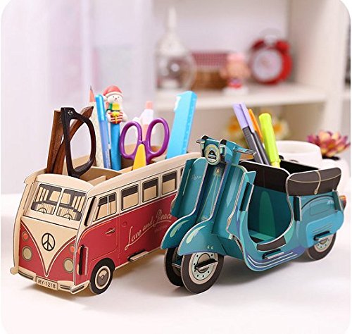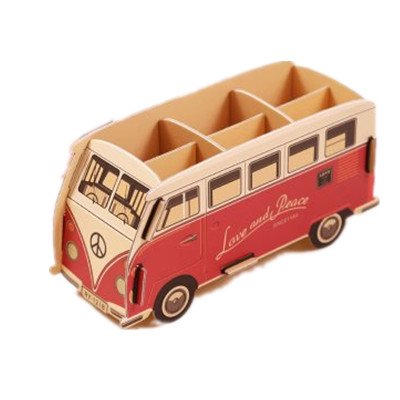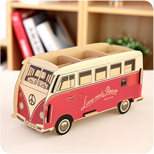 Lingdun Cartoon DIY Wooden Office Desk Stationery Organizer Storage Box Pen/Pencil,Cell Phone, Business Name Cards Remote Control Holde (BUS Pattern)