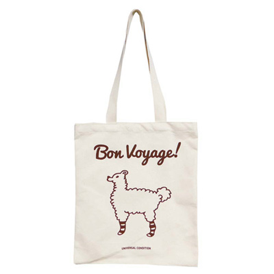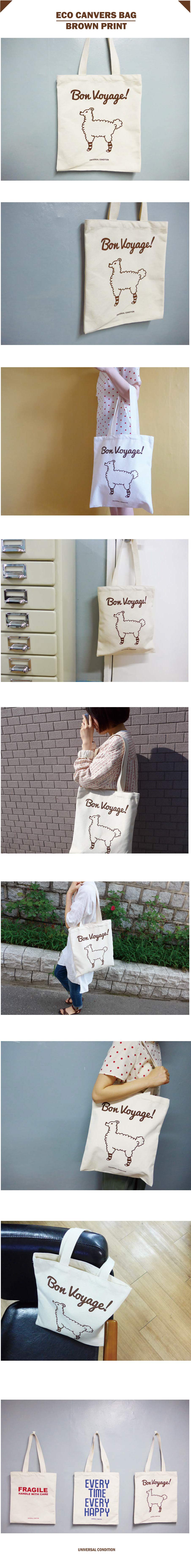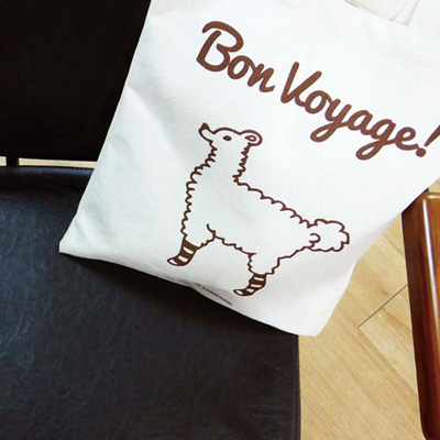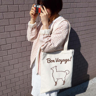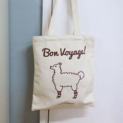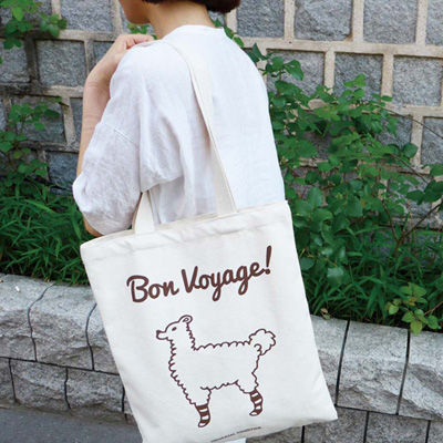 두께감있는 미색 캔버스소재로 되어 있으며. BON VOYAGE 영문과 귀여운 알파카가 프린트되어 있습니다.