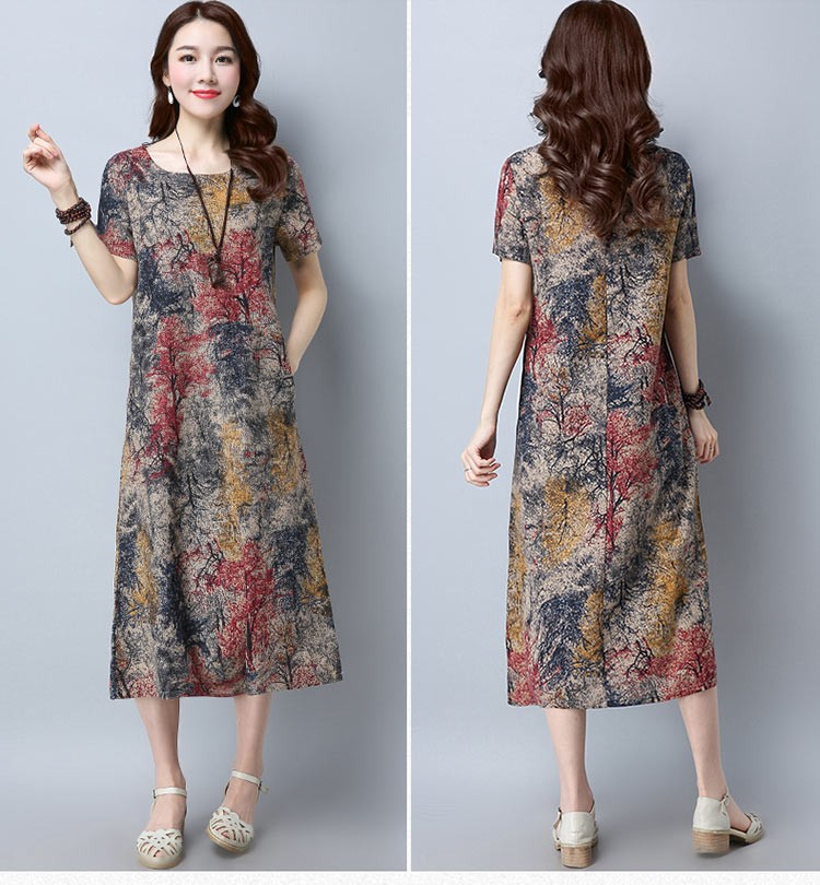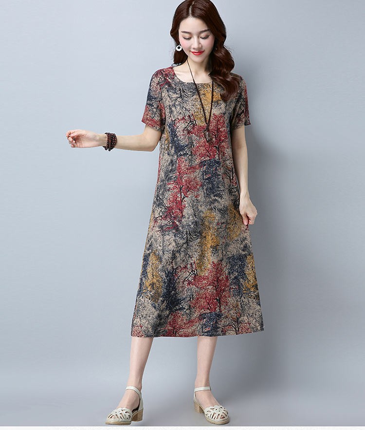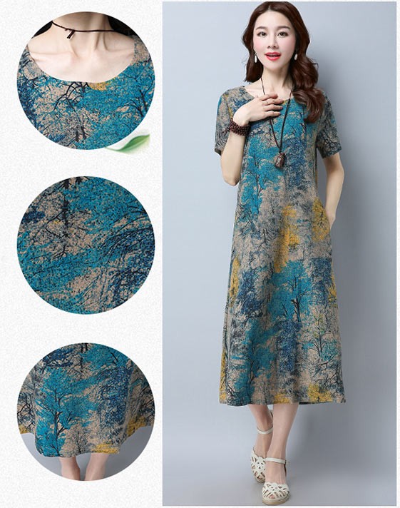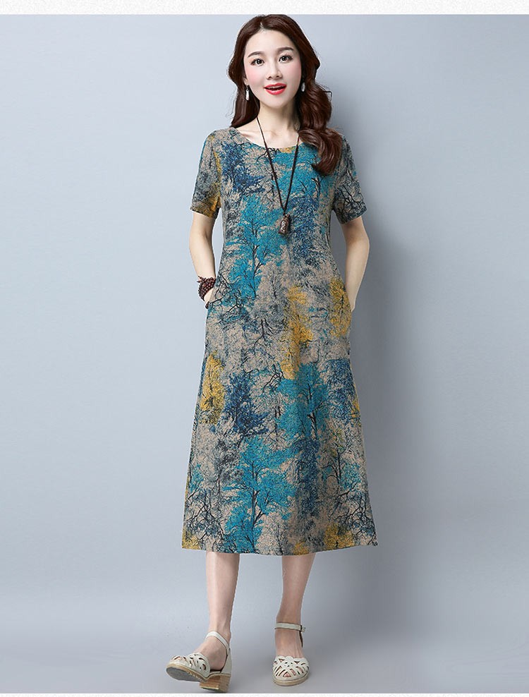 水彩画のようなシックなプリントのラウンドネック・半袖ワンピース♪