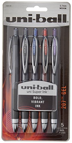 -. Feature : Make a striking statement with thick, vibrant gel ink in intensely bold colors / Premium grip provides Superior writing comfort and control / Features uni Super ink which protects against water, fading and fraud / Refillable design with a stylish translucent ink window and attractive metal accents / Includes: 1 red, 1 blue, 1 purple and 2 black gel pens, 0.7mm medium point