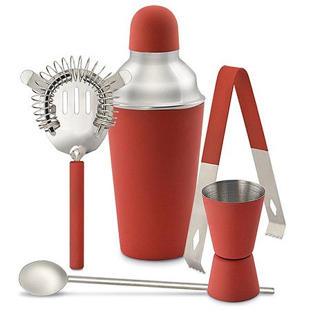 -. Title : Happy Hour Red Barware Set with Cocktail Shaker,Spoon,Strainer,Tongs & Jigger
