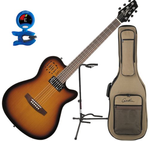 Studio : Godin Guitars Publisher : Godin Guitars Binding : Electronics Product Description The high-gloss Godin A6 Ultra HG Semi-Acoustic-Electric Guitar boasts the innovations found in all Godin A-series guitars. You get plugged-in acoustic sound with the feel of an electric guitar neck, and a chambered body that virtually eliminates feedback in live and loud settings. The A6 Ultra HG guitar also has the added "oomph" and full tone of a Godin hum bucker pickup in the neck position. An under-saddle transducer, dual outputs (acoustic and electric) that combine for a huge stereo sound and a Custom Godin preamp voiced specifically for the A6 Ultra HG help construct the tones you want. The preamp gives guitarists tone control via sliders for acoustic volume, treble, mid, bass, and independent controls for the electric hum bucker's volume, treble and bass. Whether plugging into the single acoustic mix or in stereo (via both outputs), controlling your Godin A6 guitar's tone is at your finger tips. And the high-gloss A6 Ultra guitar delivers in all styles of music from jazz to rock to country as well as being a great blues slide guitar. A solid cedar top, a 2-chambered silver leaf maple body, the high-gloss finish, a mahogany neck with rosewood fingerboard, and the comfortable feel of an ergo cut back complete the Godin high gloss Ultra A6 guitar. 0