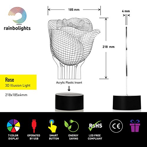 A UNIQUE ROSE LIGHT that you will LOVE and looks great in the dark. The BEST night light that COMES ALIVE in the dark. 7 COLOR 3D EFFECT LED light which DOES NOT GET HOT. See through perspex in the day and doesn’t need much space so it’s very FLEXIBLE