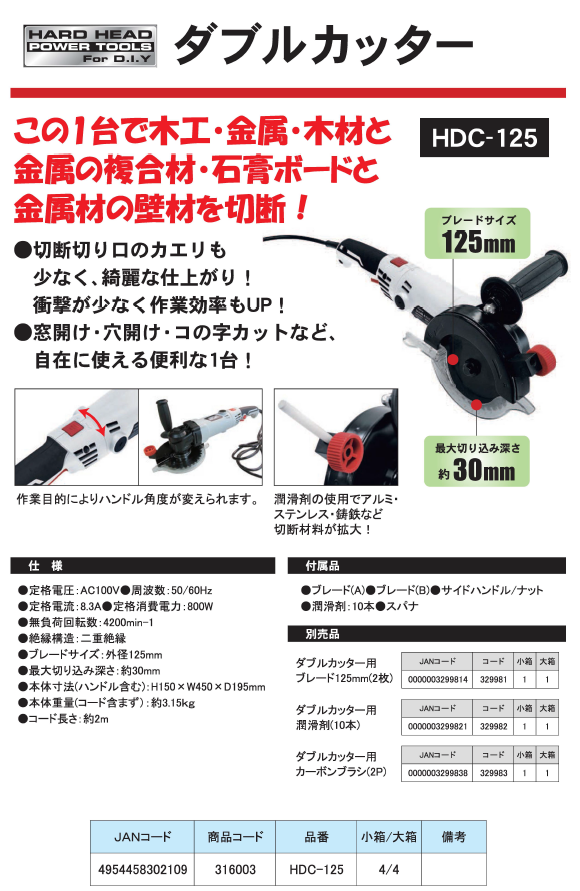 【商品名】H&H ダブルカッター(木工/木材/金属用 切断機) HDC-125mm