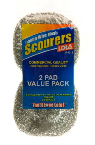Studio : Lola Products Publisher : Lola Products Binding : Kitchen Product Description This is a JUMBO version of our Wire Mesh Scourer. This galvanized steel knitted flat wire mesh scourer is heavy duty for tough jobs. It is odor and rust resistant. Be sure to rinse pad clean after each use, and rest on a towel or sponge rest (Do not rest directly on the countertop or in the sink). This item is sold in a convenient 2 pack. 0