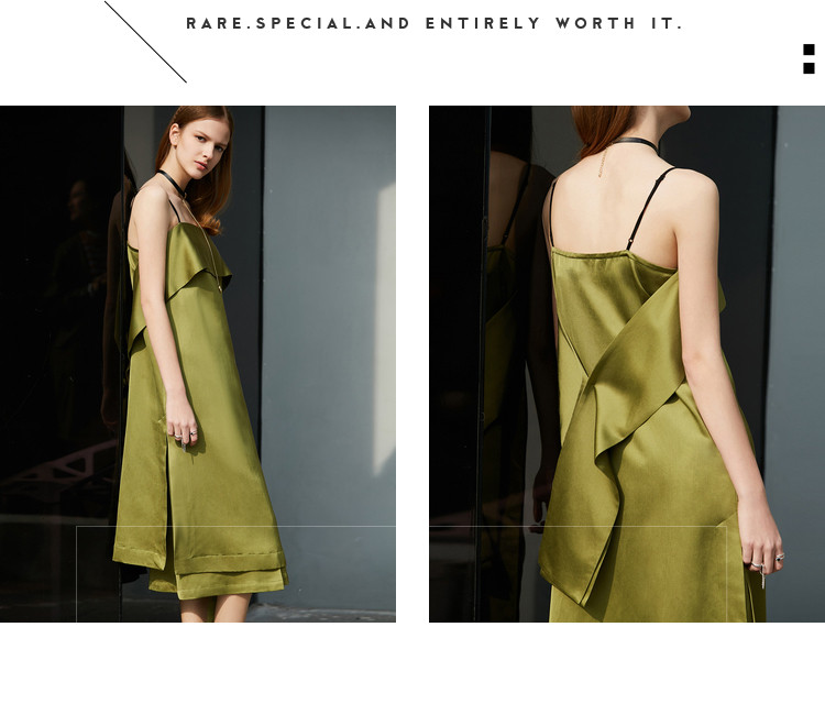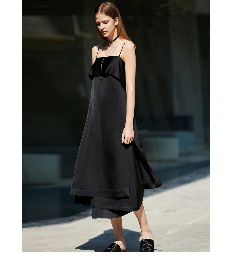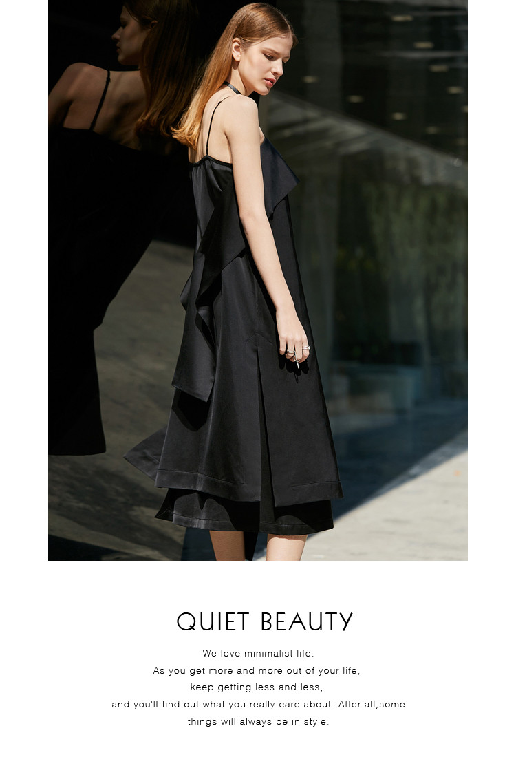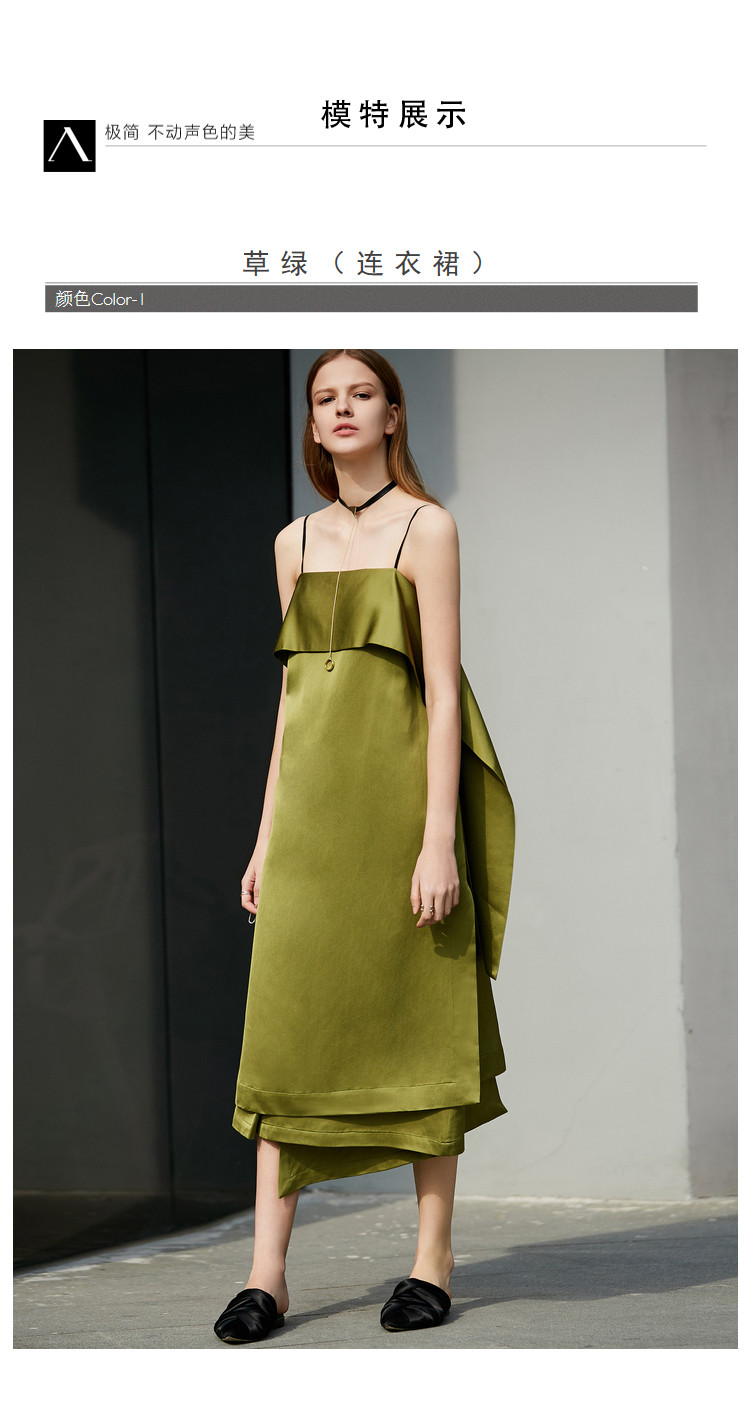 连衣裙纤细肩带展现性感美背线条,半裙落差下摆洋溢时尚活力。