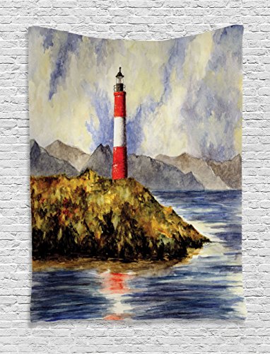 Ambesonne Lighthouse Decor Collection, Les Eclaireurs Lighthouse Coastline Seashore Mountains Cliff Painting Effect, Bedroom Living Room Dorm Wall Hanging Tapestry, Blue Red Green Gray
