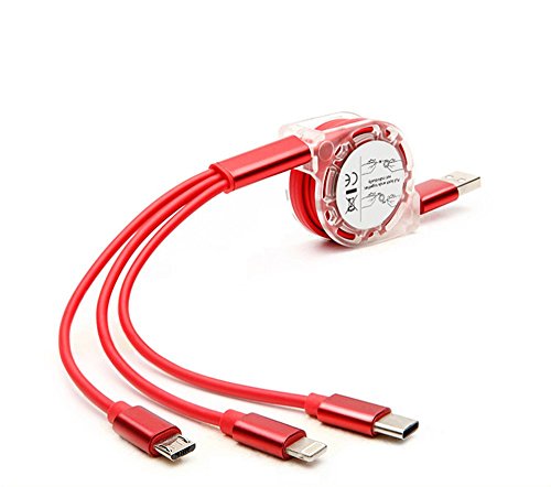 -. Feature : RETRACTABLE FASHION DESIGN: This smart gadget is for your Apple & Android & Type C devices to charge easily & conveniently with retractable rolling design.With 4 length positions to meet your practical use(MAX 3feet/1Meters)at home or office, car or school / FAST & STABLE CHARGING: With the help of high quality wire copper core inside the cable, it supports standard 2.1A electricity output, fast & stable, allow you get more fun with your cellphone and less time wait for charging / 3 in 1 INTERFACE PRESENT: Type-C+ 8 Pin Lightning+ Micro USB are made in 1 which is optimal to use.It supports 3 devices charging at the same time, you can easily share charging with friend's different devices. / UNIVERSAL COMPATIBLE: Compatible to charge your iPhone 5 5s 5c se 6 6s 7 Plus, iPad Air Mini Pro, iPod, new MacBook, ChromeBook Pixel Samsung Galaxy S8 / S8 Plus, LG G5 / G6.ETC / ENVIRONMENT FRIENDLY MATERIAL: TPE material wrapped cable + Aluminium alloy interface. Length : 100cm(3.1 ft).Color :Gold, Silver or Rose. Please NOTE! This cable is only charging cable. We cannot guarantee that the cable is capable of transferring data.