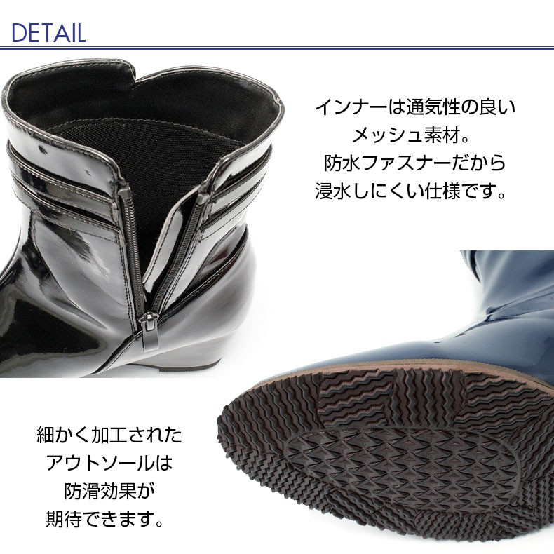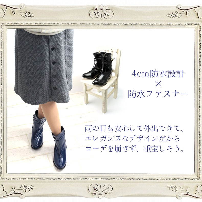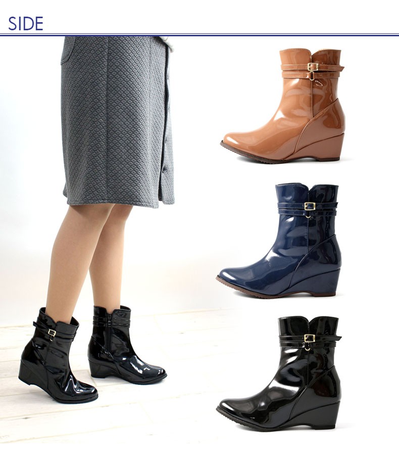 【あすつく/送料無料】【メール便不可】◆Dilly Dally 4cm防水 エナメル ウェッジ レインブーツ◆人気シューズブランド『Dilly Dally』のウェッジレインブーツ。タイトなデザインで足元を引き締めてくれますので、通勤・通学に最適。ギフトやプレゼントにもオススメです。テープ、ファスナー、裏材、中底に防水素材を使用。接地面から4cmまで防水仕様ですので、水溜りでも安心して歩けます。※完全防水ではございません。ソールは細かい凹凸デザインを採用し、急な雪や凍結でも滑りにくく安心。インナーはメッシュになっていますので、蒸れにくく快適な履き心地を保ちます。※小さめの作りとなっていますので、ワンサイズ上をお求めください。■サイズ…S(22-22.5)/M(22.5-23)/L(23.5-24)/LL(24-24.5) (cm) ■足幅…8.1/8.3/8.5/8.7■ワイズ…22.6/23.3/24/24.7 E-EE■ヒール…5.0 (共通)■ストーム…0.5 (共通)■素材…合成皮革 合成底■片足重量…300-330g (S-LL) ■ブランド…Dilly Dally■生産国…中国■商品コード…WF-2602