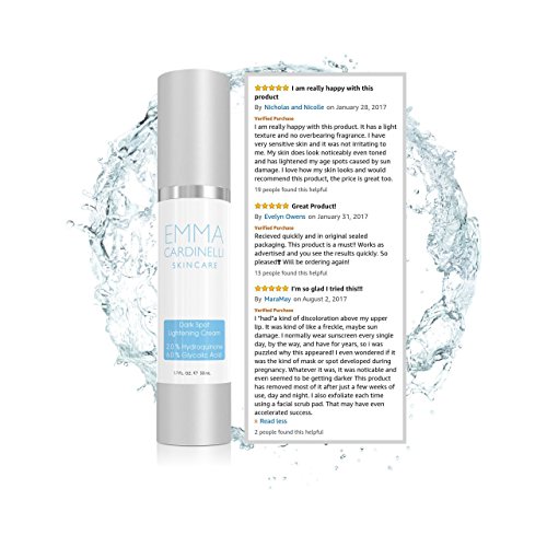 Emma Cardinelli Skin Lightening Cream with 2% Hydroquinone and 6% Glycolic Acid 1.7 oz. Results for discolorations should appear after 4-6 weeks of consistent use. Our products are carefully formulated to improve the health and appearance of your unique skin. We understand the importance of formulating with the best combinations of innovative ingredients to provide you with safe, highly effective products that deliver on their promises. 100% fragrance free, clinically proven to be non-irritating, and never tested on animals. OUR PROMISE TO YOU - We take pride in our formulas and stand behind them 100%. If for any reason you are not satisfied with the product or results, simply message us and we will process you an immediate refund - no questions asked.Feature