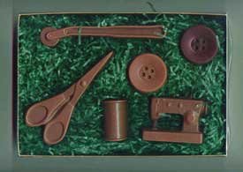 -. Feature : Chocolate Sewing Kit Includes: One (1) Milk Chocolate Scissors, One (1) Milk Chocolate Spool of Thread, One (1) Milk Chocolate Pattern Marker Wheel, One (1) Milk Chocolate Sewing Machine, One (1) Milk Chocolate Button, and One (1) Dark Chocolate Button. / Made with The Chocolate Vault's High Quality Milk and Dark Chocolate. / Wt: 4.1 oz. / Presented in a box, with a see-thru lid. / SAVE ON SHIPPING when ordering multiple chocolate favors from The Chocolate Vault's Molded Chocolate Inventory.