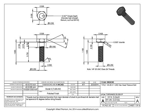 Allied Titanium 0004240, (Pack of 10) 1/4-20 X 1 UNC Titanium Hex Head Bolt, Grade 5 (Ti-6Al-4V)