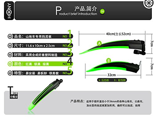 -. Feature : Stylish design and high quality / Suitable for Road/Mountain Bike, Folding Bike etc. / Light weight and easy to assemble / Easily install and adjust height of the rear mudguard / Keeps your bicycle clean