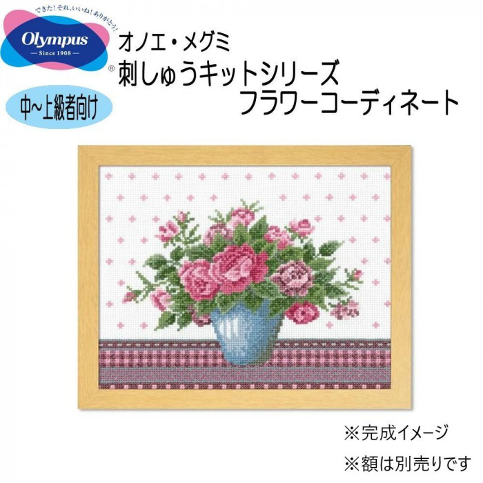 「フラワーコーディネート」をテーマに様々なカラーのお花と花瓶をクロスステッチで表現しました。色とりどりのししゅう糸を使ってお楽しみください。 |