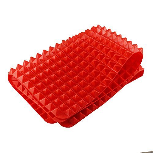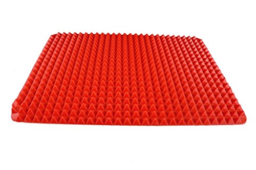 Studio : Mat Magic-FES Publisher : Mat Magic-FES Product Description Size: 16 x 11.5 x 0.4 inches Color: Red Material Type: Silicone 1. The Home Silicone Baking Mat features Pyramid-shaped contours which allows Air to circulate under and around the food. 2. The food never comes in contact with the bottom of the Mat, fat grease drain to the bottom leaving you light crispy results. 3. This Non-Stick Baking Mat is made with 100% Food Grade Silicone with FDA compliance. 4. Very easy to clean and is Flexible which can be rolled up for easy storage and save space. 5. Use for multiple purposes from Baking, Trivet, Drying Rack, Non-Slip surface for cutting board, Pot holder to Grip to open Jars 0
