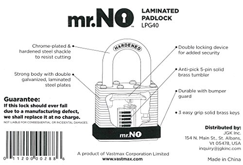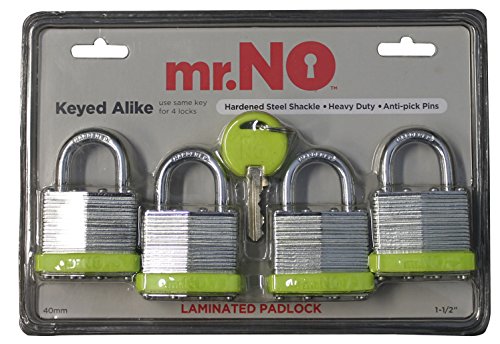 -. Feature : Set of 4 Heavy Duty laminated padlocks / Anti-Pick: 5-Pin brass tumbler, Double locking device / Shackle made of high quality chrome plated hardened steel / http://mrnolock.com/ Quality assurance over 20 yrs manufacturing excellence / 3 keys - Keyed alike to fit all 4 locks