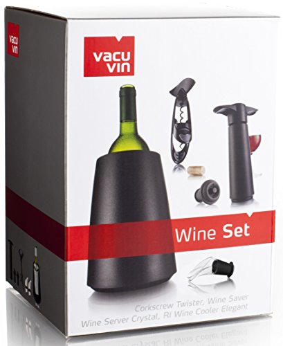 -. Feature : Collection of high-quality Vacu Vin wine products / Contains: 1 x Wine Saver Vacuum Pump, 2 x Vacuum Bottle Stoppers, 1 x Elegant Wine Cooler, 1 x Twister Corkscrew and 2 x Wine Servers/Pourers / Combination of gadgets will enhance the preparation, serving and preservation of wine / All items are easy to maintain and are highly durable / Attractively packaged - ideal for gifts/presents