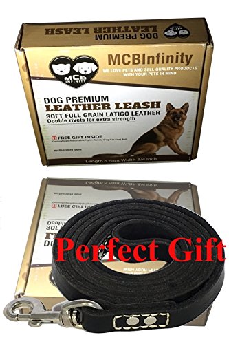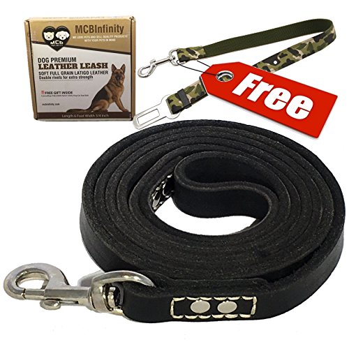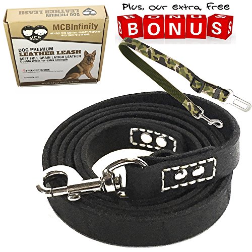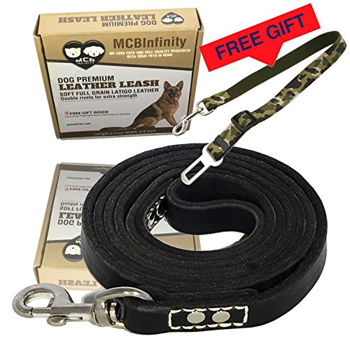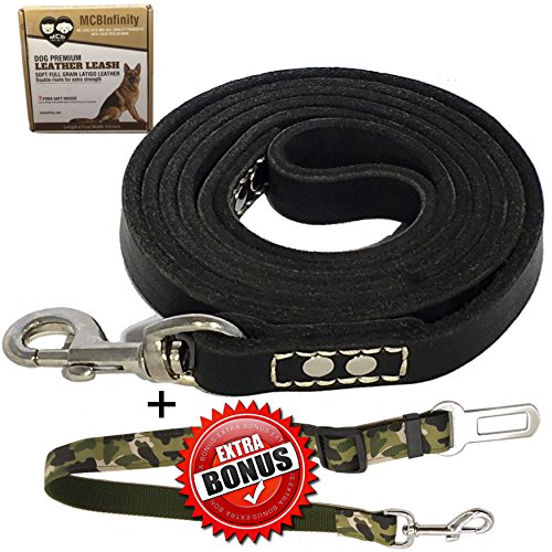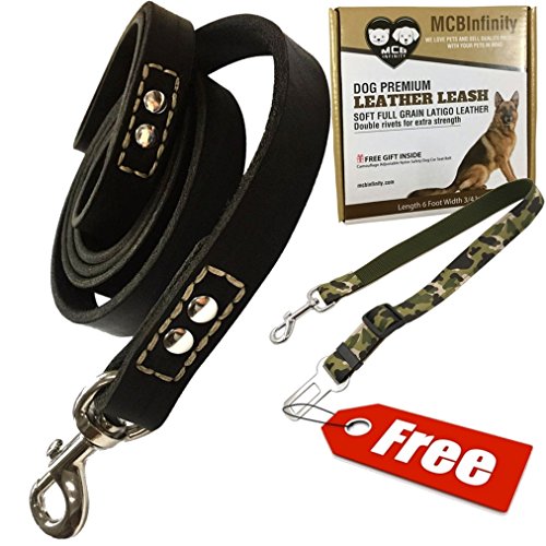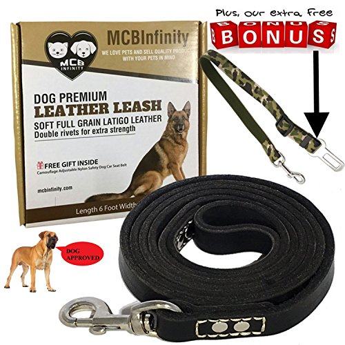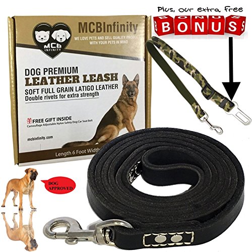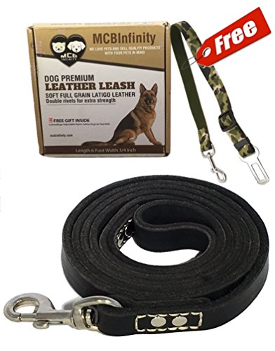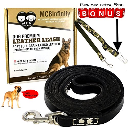 KEEP YOUR DOG HAPPY and comfortable with MCBInfinity handsome leather leash. * * C A U T I O N * * NOT CHEW RESISTANT Puppies LOVE to chew leather, If given the opportunity, your puppy WILL chew through ANY LEATHER LEASH. If your dog is a chewer - keep the leash away from his/her mouth. Order with Confidence! MCBInfinity Leather leash is strong, however, we went above and beyond and added 2 RIVETS on both Ends for extra strength Cheaper leather leashes cut corners which results in an inferior "stretchy" feel. They tend to crack or split easily with normal wear and tear. A secured dog is a happy confident dog. MCBInfinity leather leash is extra durable Heavy Duty 6 feet in length, ¾ inch width. Our FREE GIFT to you is a camouflage car safety dog belt and Dog Obedience Ebook *WARNING* For your pet's safety: Do not attach the free gift pet car seat belt to your pet's collar. The pet car seat belt should be used solely with a pet body harness. At MCBInfinity we LOVE PETS AND SELL QUALITY PRODUCTS WITH YOUR PETS IN MIND that's why we give you a full 1 year warranty Here's what you get Premium leather leash 6ft ¾ inch Gift camouflage safety dog car belt Everything in a box suitable as a gift 0 |