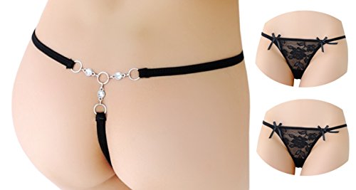 -. Feature : 3er Sexy String Tanga Set in Sexy Look / Aussergewöhnliches Design - Hinten mit Ringen & Strass Steinen / Elastisches Material - Erotisch Transparent / Verführerisches Dessous aus Spitze / Größe: 34-36