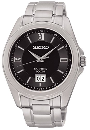Seiko 남성용 시계.실버 스테인레스 케이스 와 실버 스테인레스 스트랩.블랙 다이얼.쿼츠 동작.양쪽으로 열림 원 푸쉬타입잠그개.방수 가공 100 미터.