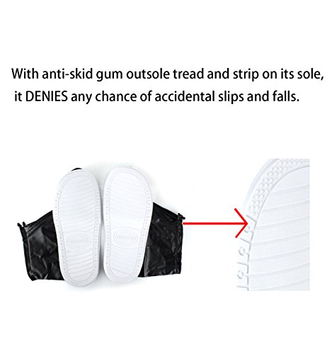 - THICKEN RUBBER SOLE: Non-slip; With anti-skid gum outsole tread and strip on its sole, it DENIES any chance of accidental slips and falls. The cool looking shoe covers works perfectly fine on a rainy ground, solid water block and not slippery at all. The shoecovers keep your feet dry during periodical rains.