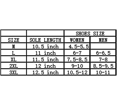 - SOLE LENGTH: M-10.5 inch, fits women shoes size US 4.5-5.5; L-11 inch, fits women shoes size US 6-7, men shoes size US 6-6.5; XL-11.5inch, fits women shoes size US 7.5-8.5, men shoes size US 7-8; 2XL-12inch, fits women shoes size US 9-10, men shoes size US 8.5-9.5; 3XL-12.5inch, fits women shoes size US 10.5-12, men shoes size US 10-11; PLS CHECK THE SIZE CAREFULLY.