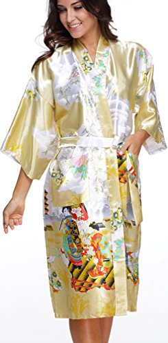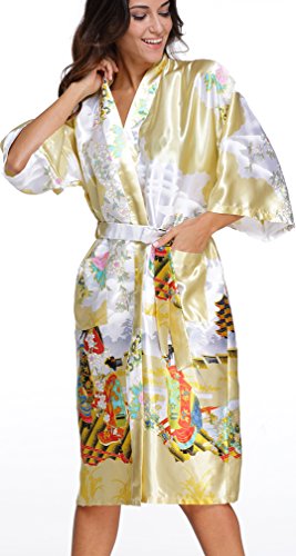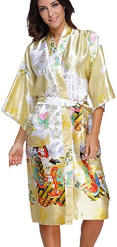 FLYCHEN Women's satin kimono robe sleepwear for ladies plus size Yellow M