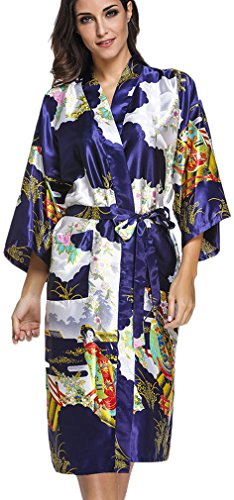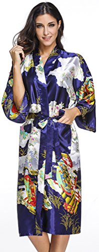FLYCHEN Women's satin kimono robe sleepwear for ladies plus size Navy Blue M