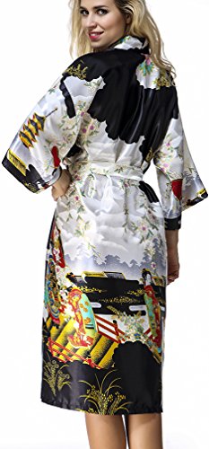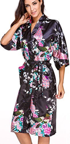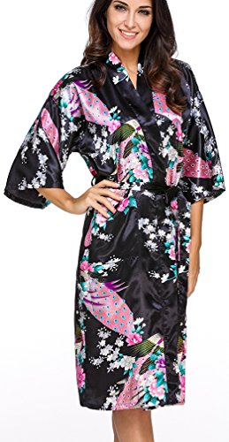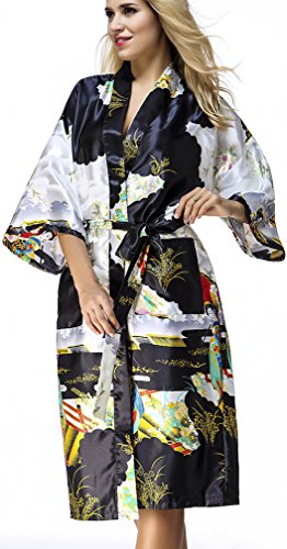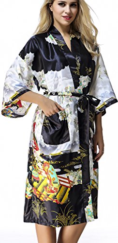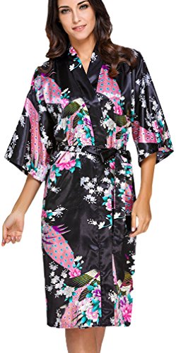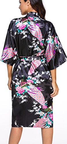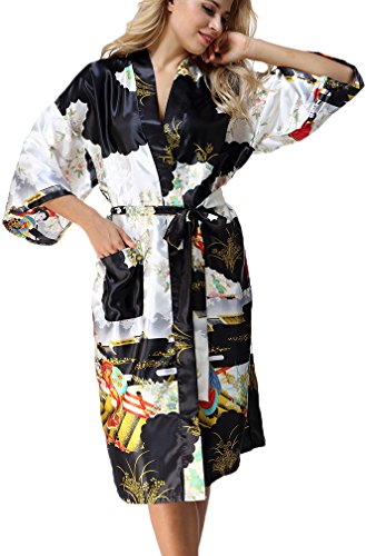 FLYCHEN Women's satin kimono robe sleepwear for ladies plus size (M, Black-6)