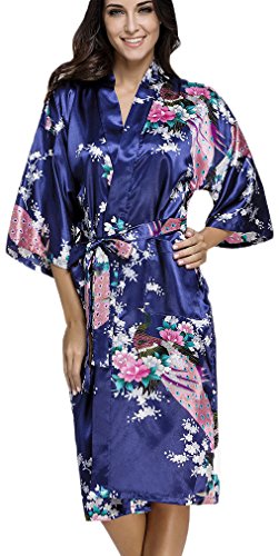 FLYCHEN Women's satin kimono robe sleepwear for ladies plus size Blue Peacock M