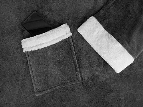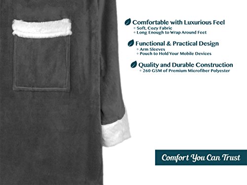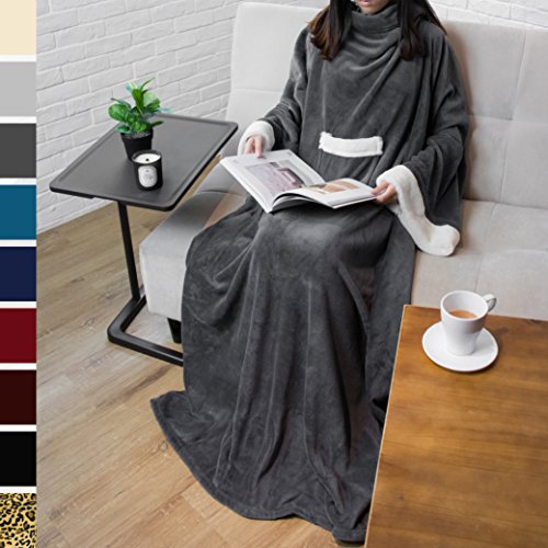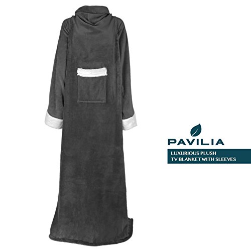 Product Description Luxurious Fleece Blanket with Sleeves by Pavilia ? This Luxurious Fleece Blanket with Sleeves by Pavilia is constructed with 260 GSM of microfiber polyester that is extremely comfortable with a luxurious feel at the same time. We also added a special cuff to this TV blanket for touch of elegance. ? Ideal for keep you cozy while lounging and watching tv, the blanket also comes with sleeves and a functional pocket so you have full arm mobility while relaxing on your sofa/bed! It's also long enough to wrap around your feet for extra warmth. ? Measures 70' x 50' and available in 9 Colors - Black, Charcoal, Brown, Latte, Navy, Light Gray, Wine, Sea Blue, Cheetah - so you can mix and match! Pavilia is the Comfort You Can Trust. Our Vision To provide premium home goods that improves and enriches the life of everyone. We will continue to innovate and bring exciting products to market so you can enjoy life more! Our Products At Pavilia, we offer an extensive line of throws and blankets that are made of premium fabrics for different use cases. Our blankets comes in different patterns, trims, and colors, making them the perfect choices for mixing and matching, and complementing your home. Furthermore, we incorporated practical designs into our blankets such as arm sleeves so you can take the joy of lying around your couch to the next level! 0