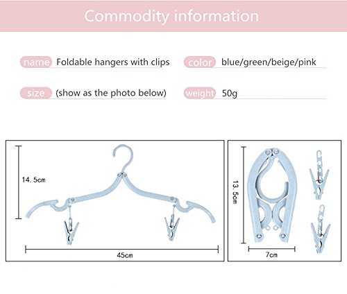 Comes with 4 pcs hangers(blue, green, beige, pink) and 8 hanger clips. Great for business travel. Frequently used in hotels, cars, schools as well as home.