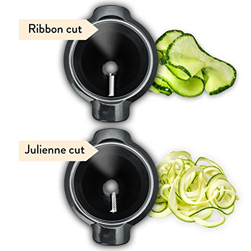 Includes two blades – ribbon blade for a ribbon cut and spiral blade for a Julienne cut
