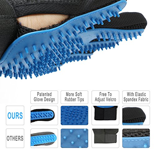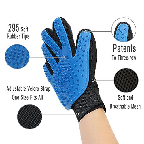 Patented Glove Design ? Two-row Design:Too much space between each row leads to inadequate contact of hair. ? Three-row Design:Too little space between each row results in too much friction that glove may hurt your pet's skin. ? Distanced Three-row Design:Area of contact increased, gloves can improve your working efficiency to the greatest extent without hurting your pet's hair or skin.