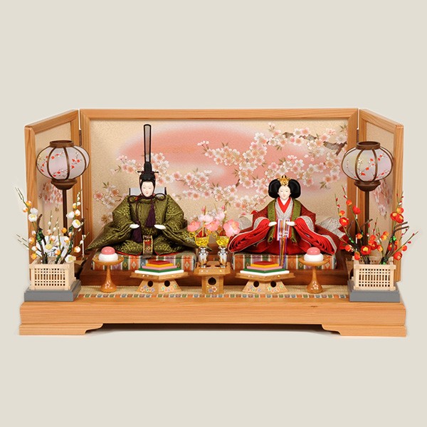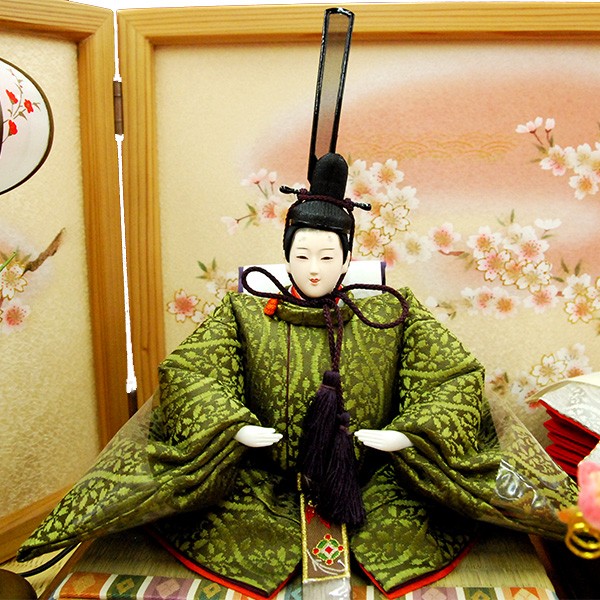 ・台座・屏風等には落ち着いた色目の雛人形セット。
