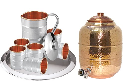 -. Feature : Diwali Gift,Corporate Gift Copper Water Tank,1 Stainless Steel Tray, 6 Outside Steel Inside Copper Glasses & 1 Copper Jug / Jug Weight: 400 g; Jug Capacity: 1500 ml; Jug dimensions: 12.5 cm X 12.5 cm X 20 cm; Glass Weight each: 280 g; Glass Capacity each: 280 ml; Glass dimensions each: 8.7 cm X 8.7 cm X 11.5 cm,Dimensions Of Tray:12.4 x 11.1 x 0.5 inches,,Water Tank dimensions each: 19 cm X 19 cm X 26 cm, Water Tank 8 Litres,Weight Of Water Tank 1360 gm / Water stored over night in copper utensil is essential for hemoglobin synthesis, bone strength and immunity building. Copper helps in maintaining digestive health, healing wounds and relieving pains. Copper is an antioxidant and anti-carcinogenic that prevents cell damage and slows aging. Copper is P.R.Imary element to produce melanin (pigmentation of eyes, hair and skin) in human body. / Artisan crafted handmade metal ware is made by skilled craftsmen in india. / 'King International'' is a registered brand does not authorize any other seller to sell their products under their name.''King International'' does not provide any quality assurance of fake products bought from other sellers.