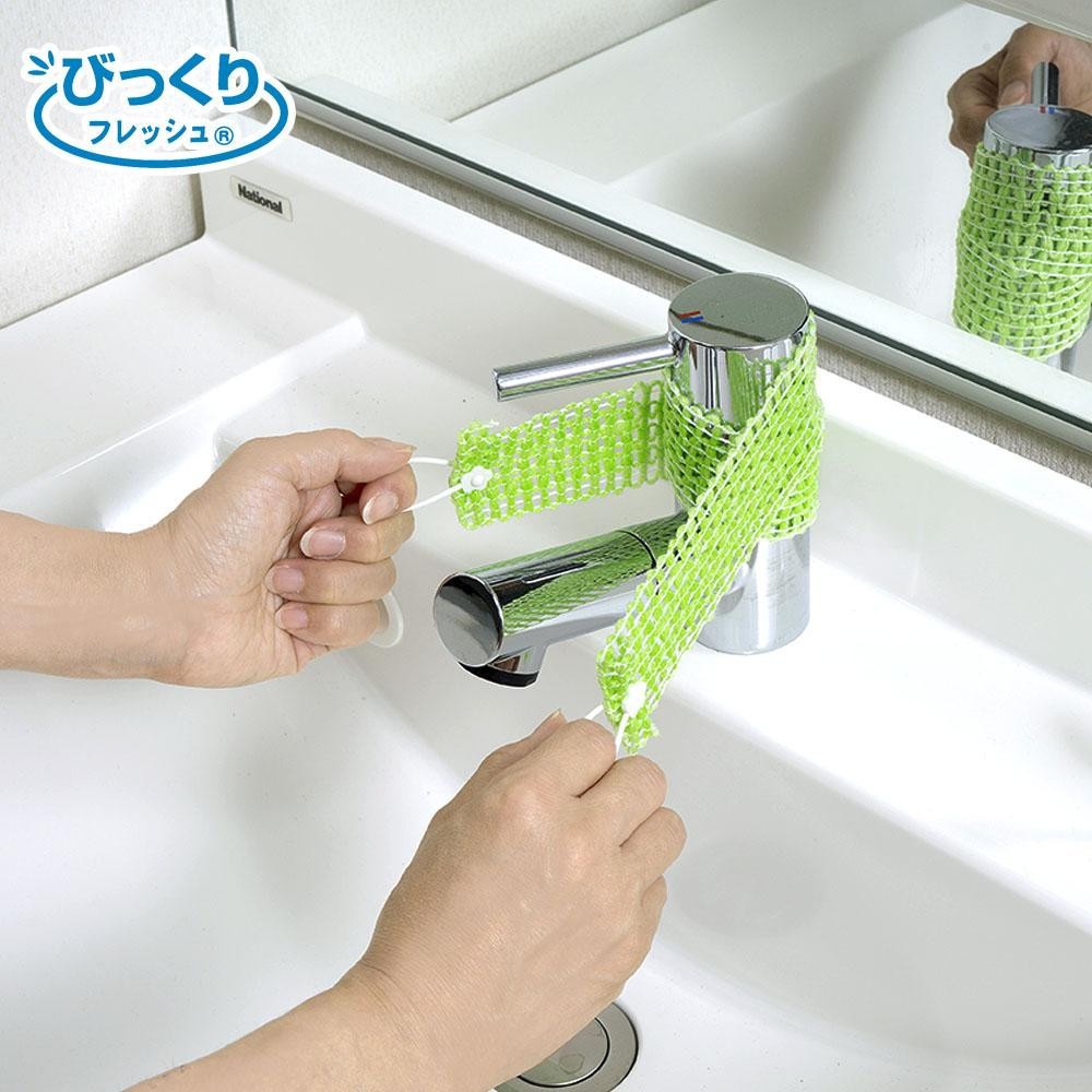 | 水だけで汚れが落ちる!!洗いたい場所に巻きつけて引っ張るだけで、巻いた部分が綺麗になります♪使いたいサイズに合わせてカットし、フックは引っ張りやすいように左右に付けてご使用ください(付けなくてもご使用いただけます)。柔らかい特殊断面形状の繊維を使用しているので、キズをつけずに洗うことができます。メッシュ状になっているので乾きが速く衛生的に使えます♪ |