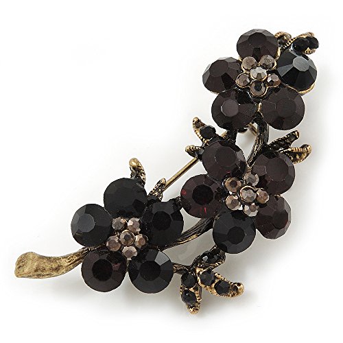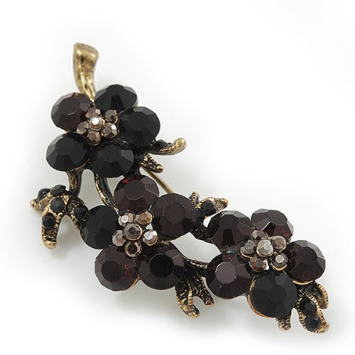 -. Title : Swarovski Crystal Floral Brooch (Antique Gold & Black) - 5.5cm Length