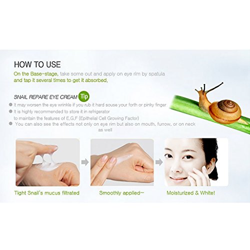 Excellent Skin Recovery Effect [Filtered Snail Slime 80%] Mucin, known for snail slime, has outstanding skin recovery effect. This ingredient restores skin swiftly and delivers various active ingredients deep in skin to reinforce skin's own re-productivity. Containing E.G.F E.G.F is a cell component which decreases starting from age 25, and this proceeds skin aging. Snail repair eye cream containing E.G.F helps eye skin maintain elastic and bright. From Fine Wrinkles to Deep Wrinkles - Certified for Anti-Aging [Adenosin] KFDA announced Wrinkle - free ingredient, Adenosin, and ingredient particularly famous for wrinkle relief, Peptide, effectively improve wrinkles. Dark Circle Care - Certified for Whitening [Niacinamide] Skin layer of eye is very thin. When darkening starts, dark shadow appears remarkably. Niacinamide contained in Snail Repair Eye Cream is an announced factor for whitening, controls melanin produce around eye skin to make your skin bright and shiny. Tight Texture Increases Absorption Filtered snail slime's own texture contained in eye cream. You can spread gently on skin and feel moisturized for longer. It helps to increase absorption not to leave sticky feeling [How to Use] At Base, take appropriate amount with spatula, spread tapping light