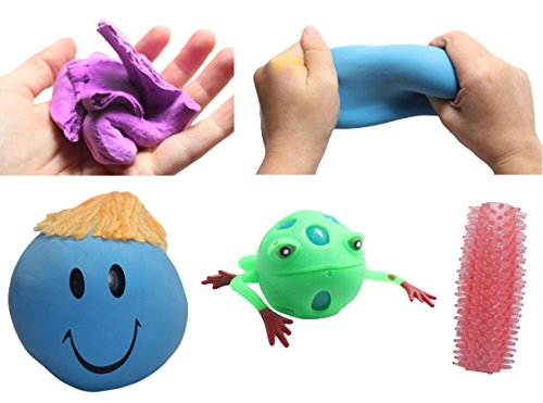 This toy bundle includes a variety of sensory rich toys bundled for adults or children who have sensory processing disorders or who need sensory integration therapy. These sensory tools can be played with and explored to work on tactile input receptors. Fun Face Ball - This is the absolute best fidget or stress toy. It is simply a balloon filled with flour with a face printed on it. There is also yarn glued on. These are fun because you can stretch and twist the face into whichever mood you desire, and the best part is they stay in the shape that you molded! These are surprisingly durable, I watched as several people played with them, and the little neighbor girl even twisted a part of the balloon several times and tied a little knot and it still did not break. Please note that the hair is only glued on so the yarn will fall off. 1 random color Stretch Ball -The ball is about 2.5" when it is round, but can be stretched out! This is very calming because it has a very silky soft feel, and you can pull and indent it multiple ways. I like it because you can turn it and pinch it just like you did in elementary school when you made pinch pots with clay. You need to feel it to really know how nice these are. 1 Random color. Bounce Putty - This putty is so soft and lightweight. It is almost like an airy foam material and it really bouncy! It is really fun to bounce, mold and squish, and it is not sticky, slimy or messy like other putties and slimes (and leaves no residue!) This putty is a perfect compound to mold different objects like play-doh. 2.75" container. Includes 1 random color. Pokey Pencil Grip - This is a sensory pencil grip. It is covered with tiny massaging bristles. Approx. 2" in sizeFeature