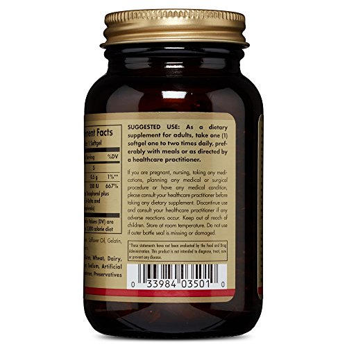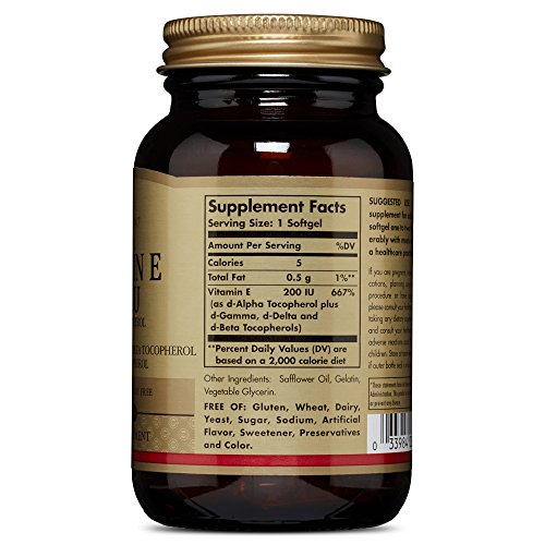 -. Feature : WHY VITAMIN E? - Vitamin E is the body's P.R.Imary, fat-soluble antioxidant as well as an essential nutrient. These are oil-based softgels in order to promote optimal absorption an assimilation. / HOW IT HELPS - Vitamin E provides nutritional support for many cells including heart muscle cells and the immune system. It also helps the body fight cell-damaging free radicals that cause oxidative stress on in the body that be a contributing factor to premature aging of cells. / WHAT'S INSIDE - The formulation of Solgar Vitamin E 200 IU softgels provides a natural source of Vitamin E (as d-Alpha tocopherol plus d-Gamma, d-Delta and d-Beta tocopherols). / GLUTEN-FREE - These softgels are free of gluten, wheat, dairy, yeast, sugar, and sodium. They are also free of artificial flavors, sweeteners, preservatives and colors. / Natural Vitamin E is an essential nutrient and is the body's P.R.Imary, fat-soluble antioxidant / Vitamin E provides nutritional support for the cardiovascular system, skin, and the immune system / It helps fight cell-damaging free radicals that cause oxidative stress in the body / This formulation provides natural Vitamin E (as d-Alpha Tocopherol plus d-Beta, d-Delta and d-Gamma Tocopherols) / It is offered in oil-based softgels to promote optimal absorption and assimilation