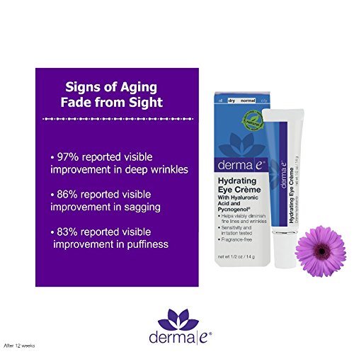 Deeply hydrate, firm and tone the delicate skin around your eyes while reducing the look of fine lines and crow's feet with our most popular, fragrance-free eye cream. Hyaluronic Acid (HA), also known as nature's moisture magnet, has the ability to hold up to 1,000 times its weight in water, binding moisture to help soften, smooth, tone and rehydrate skin. Only DERMA E has blended the unmatched hydrating properties of HA with antioxidants Pycnogenol and Green Tea, moisturizing Jojoba Oil and nourishing Vitamins A, C and E into a rich, replenishing eye cream to keep eyes young and radiant looking. 100% vegan, cruelty-free, paraben-free, sulfate-free, mineral oil-free, lanolin-free, gluten free, GMO-free. Please note that DERMA E is in a packaging transition. There is a chance your products will arrive in the older package instead of new, please know that we assure you it is the same great formula with effective results. Previously known as Hyaluronic & Pycnogenol Eye Creme.Feature