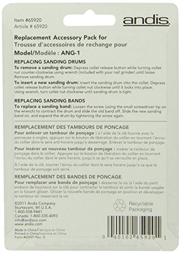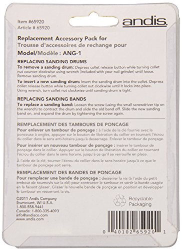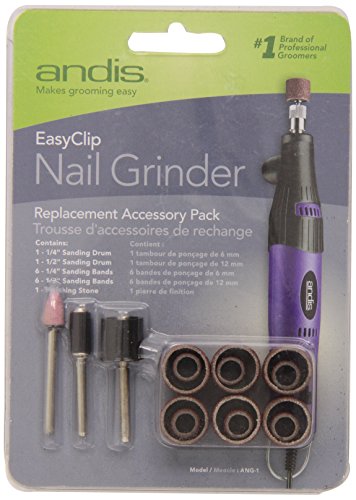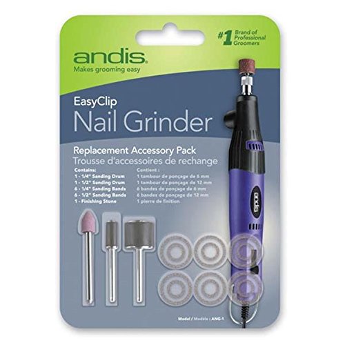 Studio : Andis (Pet) Publisher : Andis (Pet) Binding : Misc. Product Description The Andis Pet Nail Grinder Replacement Accessory Pack has two sizes of sanding drums and bands make it easy to use on any size dog or cat breed. It has a finishing stone for final shaping and a smooth finish and is an easy and quick stress-free way to give your pet a perfect pedicure. Smoother, rounded nails keep your floors and furniture safe from scratches and with this accessory pack you save money by filing your pet's nails at home. No more cutting into the quick or rough edges that occur with nail clipping. Contains: one 1/4" sanding drum, one 1/2" sanding drum, six 1/4" sanding bands, six 1/2" sanding bands and one finishing stone. 0